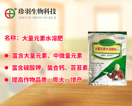大量元素水溶肥料為經(jīng)水溶解或稀釋?zhuān)糜诠喔仁┓?、葉面施肥、無(wú)土栽培、浸種蘸根等用途的液體或固體產(chǎn)品,可以葉面施肥、浸種蘸根、灌溉施肥,灌溉包括噴灌、滴灌等方式進(jìn)行灌溉時(shí)施肥,既節(jié)約用水,又節(jié)約施肥,而且還植物吸收快,大量元素水溶肥是一種可以完全溶于水的多元復(fù)合肥料,它能迅速地溶解于水中,更容易被作物吸收,而且其吸收利用率相對(duì)較高,我們看一下珍羽生物的大量水溶肥。